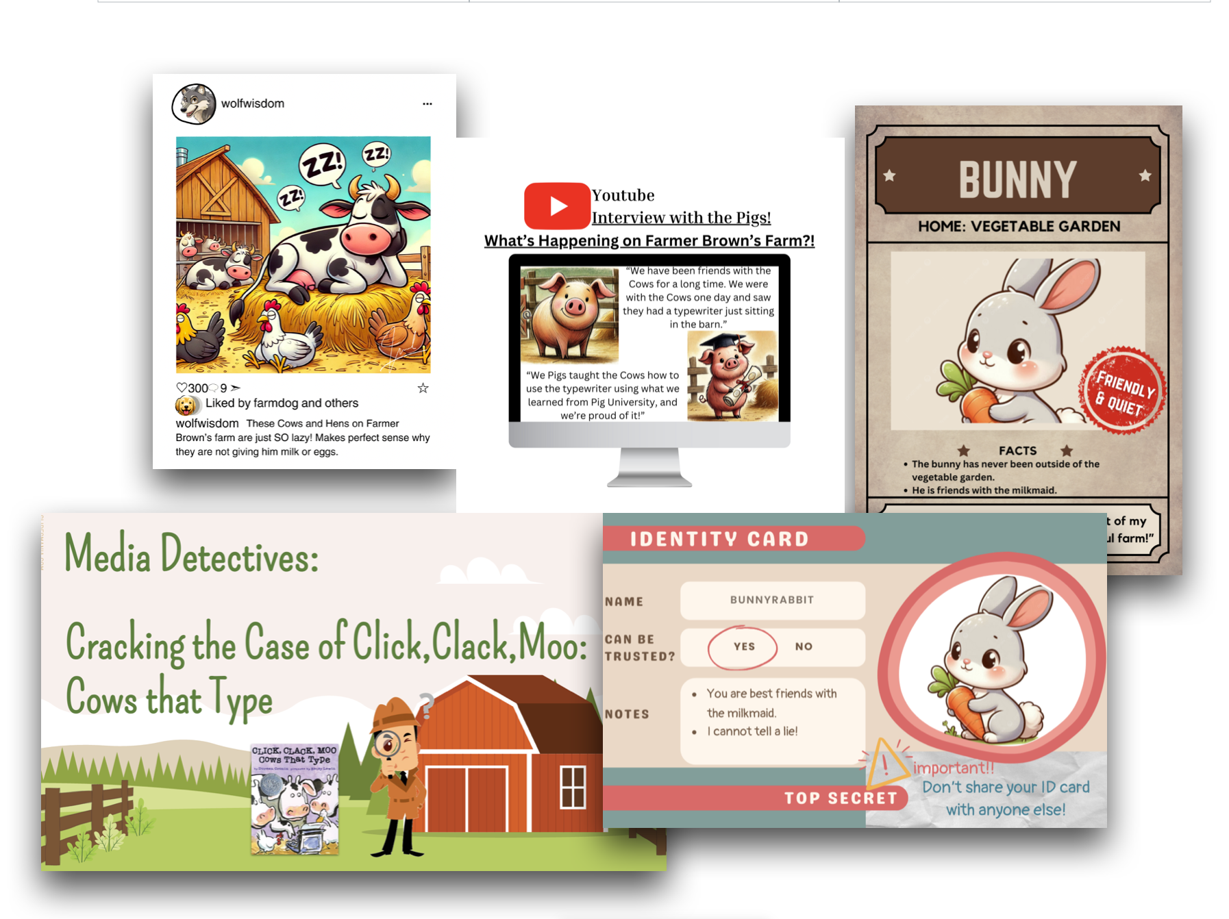 Below are some of the downloadable components of Cracking the case of Click Clack Moo including (clockwise, top left to bottom) 2 media various examples (Instagram and YouTube); a sample dossier of a witness (in this case a bunny) for detectives as well as well as a top secret identity card (for only the witness to see); opening slide of the slideshow; and below that the 1st page of the teacher protocol